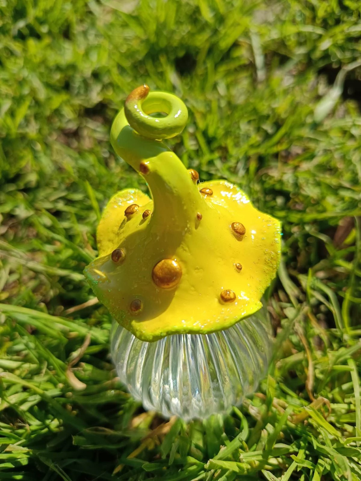Son bouchon vissable et étanche protège son contenu comme un véritable talisman. Il est orné d’un petit champignon gardien, sculpté et peint à la main, unique et chargé d’intention.