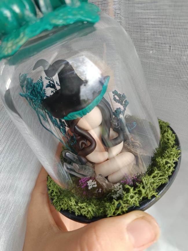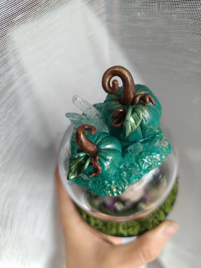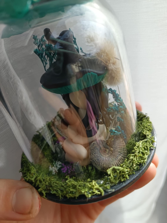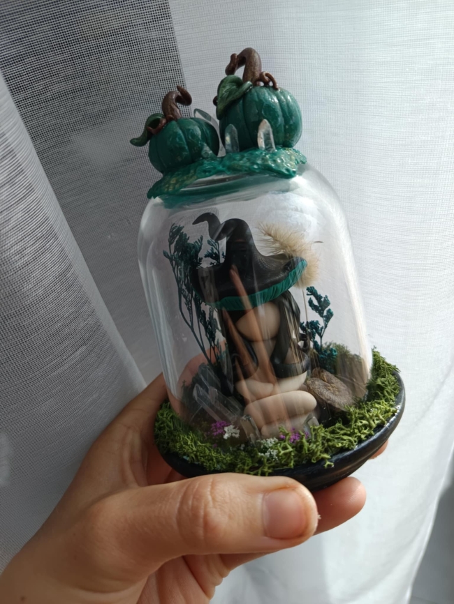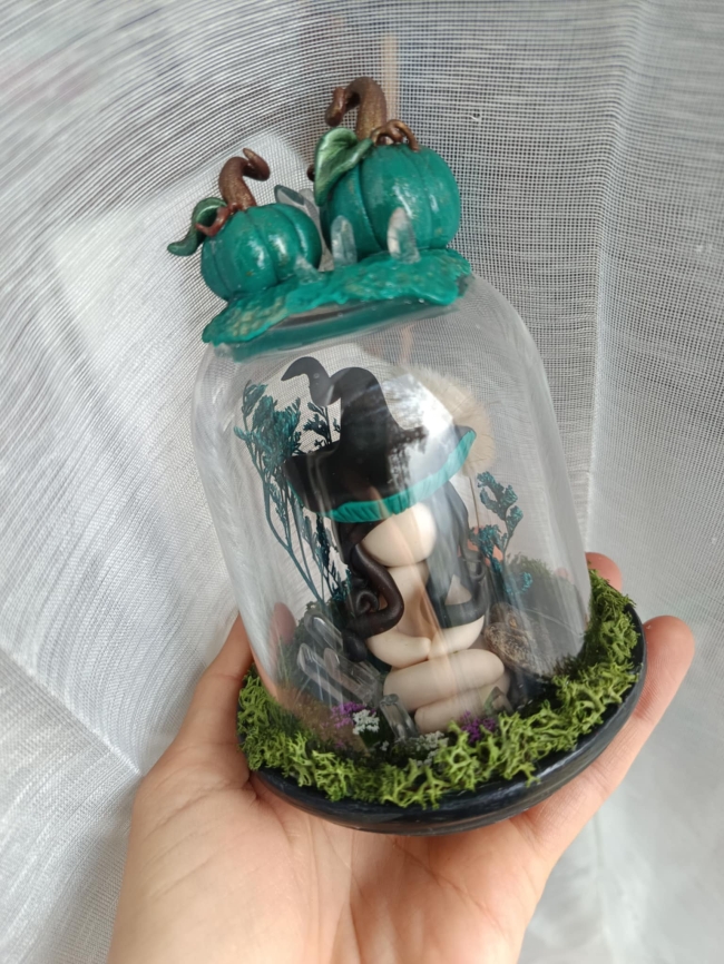 Sous sa cloche enchantée, une petite sorcière prend vie au cœur d’un décor automnal. Entourée de cristaux scintillants, de mousse féérique et de citrouilles mystérieuses, elle incarne la magie profonde de Samhain.