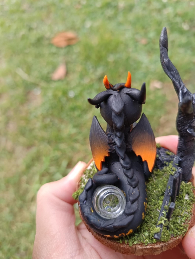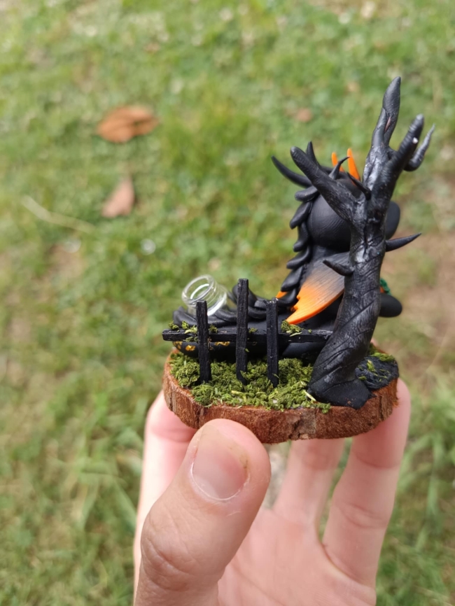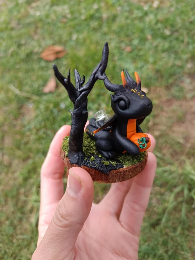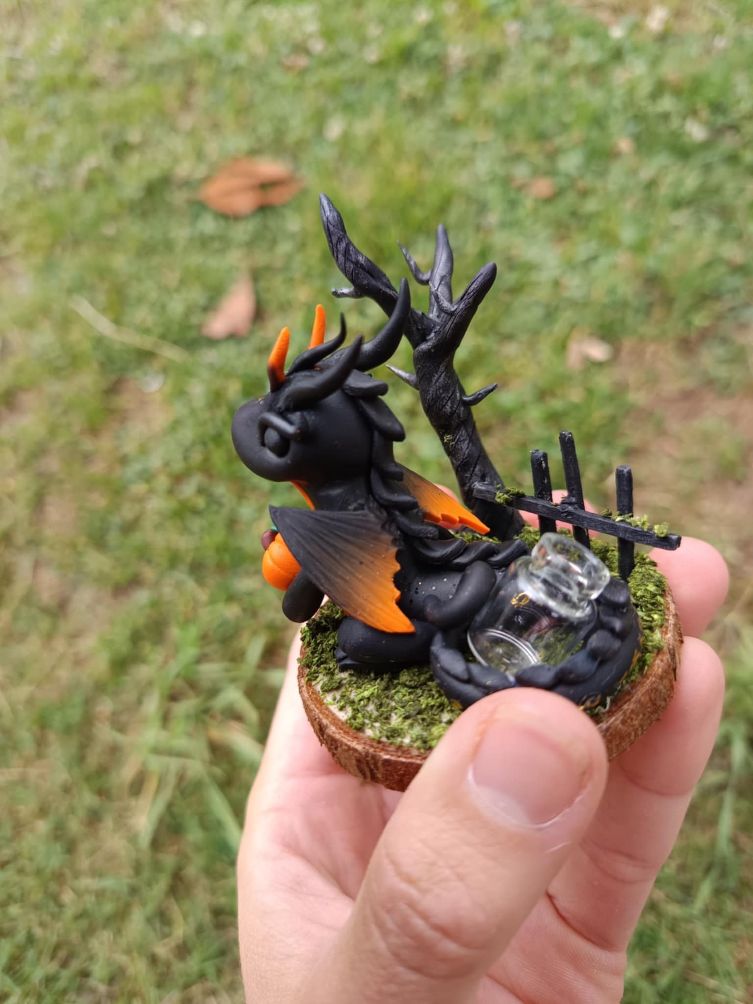 Dans les brumes d’une nuit d’Halloween, un petit dragon aux écailles flamboyantes d’orange et d’ombre noire veille devant un portail hanté, tout droit sorti d’un autre monde. Nichée dans sa patte  une citrouille se remplis de magie  comme un cœur  battant au rythme des sortilèges. Sculpté à la main en pâte polymère, chaque détail murmure un secret : le portail , habité par de vieux esprits malicieux, semble s’ouvrir sur un royaume oublié, tandis que le dragon, gardien facétieux de cette nuit enchantée, invite les âmes curieuses à s’aventurer… mais à leurs risques et périls.