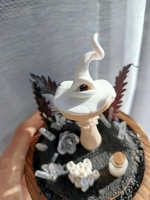 J’ouvris mon cœur, et une larme s’échappa de mon œil. En touchant le sol, elle fit naître des étincelles magiques qui se mirent à tourbillonner… et ma forêt reprit vie, mais sous une forme nouvelle. Le charbon noir resta figé au sol, des cristaux émergèrent sous mon regard émerveillé, et de longues plantes sombres apparurent.
